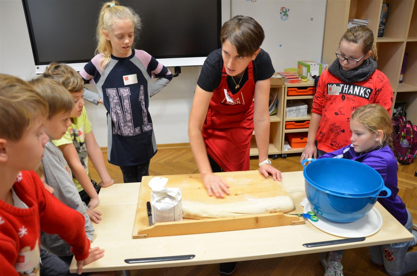 In einem kurzen theoretischen Teil erfuhren die Kinder, welche verschiedenen Getreidekörner es gibt, sowie deren Aufbau und Verarbeitung. Auch die Kennzeichnung von heimischen Lebensmitteln und die Gütesiegel wurden wiederholt. Sie erlebten, wie aus dem Korn Mehl gemahlen wird und im Anschluss wurden gemeinsam Weckerl gebacken und verkostet.