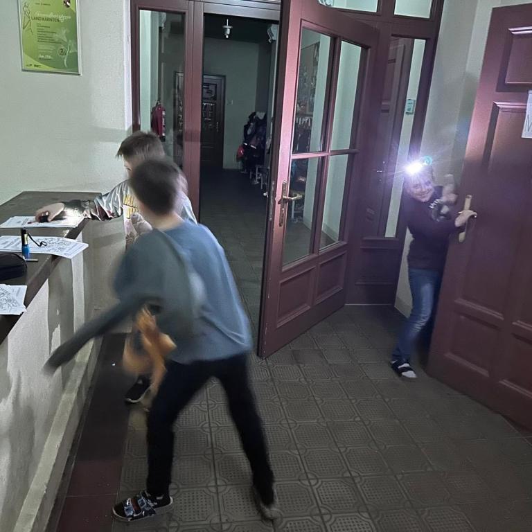 Während den Stationen in den Klassen gab es zusätzlich noch eine Mutprobe für die Kinder. Wer sich traute konnte die Stiegen auf den dunklen Dachboden betreten.